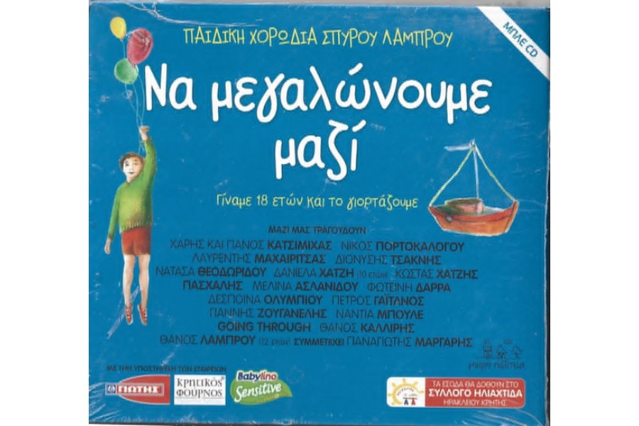 ΠΑΙΔΙΚΗ ΧΟΡΩΔΙΑ ΣΠΥΡΟΥ ΛΑΜΠΡΟΥ Nα μεγαλώνουμε μαζί Γίναμε 18 ετών και το γιορτάζουμε ΜΕ ΤΗ ΣΥΜΜΕΤΟΧΗ ΤΩΝ ΜΕΓΑΛΥΤΕΡΩΝ ΕΛΛΗΝΩΝ ΚΑΛΛΙΤΕΧΝΩΝ 51 μεγάλοι τραγουδιστές, 3 πρωτοεμφανιζόμενοι, 8 συγκροτήματα και 9 συνθέτες με ιστορία, τιμούν την πιο παραγωγική και δισκογραφική χορωδία που υπήρξε ποτέ στην ελληνική δισκογραφία. Την εξαιρετική παιδική χορωδία του Σπύρου Λάμπρου, η οποία φέτος κλείνει 18 χρόνια ακριβώς στη δισκογραφία. 4 αναπανάληπτα cd, Ο κάθε καλλιτέχνης διάλεξε από ένα τραγούδι και το τραγούδησε απλά αλλά μαγικά μαζί με τα παιδιά, με ένα πιάνο ή μια κιθάρα ή το πολύ με 4 όργανα! Πουθενά σε όλον τον κόσμο δεν έχει ξαναγίνει τέτοια συνεύρεση τόσων τραγουδιστών με παιδιά! Το αποτέλεσμα ΜΟΝΑΔΙΚΟ! 4,5 ώρες μουσικής πανδαισίας, κατάλληλη για μικρούς και μεγάλους! Δεν πρέπει να λείψει από κανένα σπίτι! ΟΛΑ τα έσοδα αυτής της έκδοσης θα δοθούν στο ίδρυμα ΗΛΙΑΧΤΙΔΑ στο Ηράκλειο της Κρήτης. Όλοι οι καλλιτέχνες και οι μουσικοί συμμετείχαν αφιλοκερδώς,τιμώντας έτσι το τεράστιο έργο αυτής της φανταστικής χορωδίας που μας έχει χαρίσει τις πιο τρυφερές στιγμές της ελληνικής δισκογραφίας,με ποιότητα και σεβασμό!