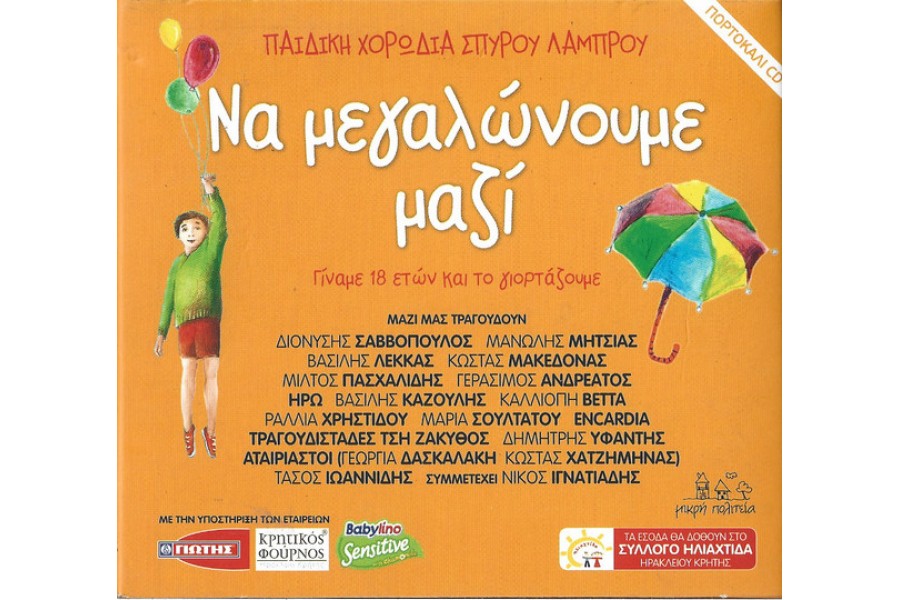 ΠΑΙΔΙΚΗ ΧΟΡΩΔΙΑ ΣΠΥΡΟΥ ΛΑΜΠΡΟΥ Nα μεγαλώνουμε μαζί Γίναμε 18 ετών και το γιορτάζουμε ΜΕ ΤΗ ΣΥΜΜΕΤΟΧΗ ΤΩΝ ΜΕΓΑΛΥΤΕΡΩΝ ΕΛΛΗΝΩΝ ΚΑΛΛΙΤΕΧΝΩΝ 51 μεγάλοι τραγουδιστές, 3 πρωτοεμφανιζόμενοι, 8 συγκροτήματα και 9 συνθέτες με ιστορία, τιμούν την πιο παραγωγική και δισκογραφική χορωδία που υπήρξε ποτέ στην ελληνική δισκογραφία. Την εξαιρετική παιδική χορωδία του Σπύρου Λάμπρου, η οποία φέτος κλείνει 18 χρόνια ακριβώς στη δισκογραφία. 4 αναπανάληπτα cd, Ο κάθε καλλιτέχνης διάλεξε από ένα τραγούδι και το τραγούδησε απλά αλλά μαγικά μαζί με τα παιδιά, με ένα πιάνο ή μια κιθάρα ή το πολύ με 4 όργανα! Πουθενά σε όλον τον κόσμο δεν έχει ξαναγίνει τέτοια συνεύρεση τόσων τραγουδιστών με παιδιά! Το αποτέλεσμα ΜΟΝΑΔΙΚΟ! 4,5 ώρες μουσικής πανδαισίας, κατάλληλη για μικρούς και μεγάλους! Δεν πρέπει να λείψει από κανένα σπίτι! ΟΛΑ τα έσοδα αυτής της έκδοσης θα δοθούν στο ίδρυμα ΗΛΙΑΧΤΙΔΑ στο Ηράκλειο της Κρήτης. Όλοι οι καλλιτέχνες και οι μουσικοί συμμετείχαν αφιλοκερδώς,τιμώντας έτσι το τεράστιο έργο αυτής της φανταστικής χορωδίας που μας έχει χαρίσει τις πιο τρυφερές στιγμές της ελληνικής δισκογραφίας,με ποιότητα και σεβασμό!